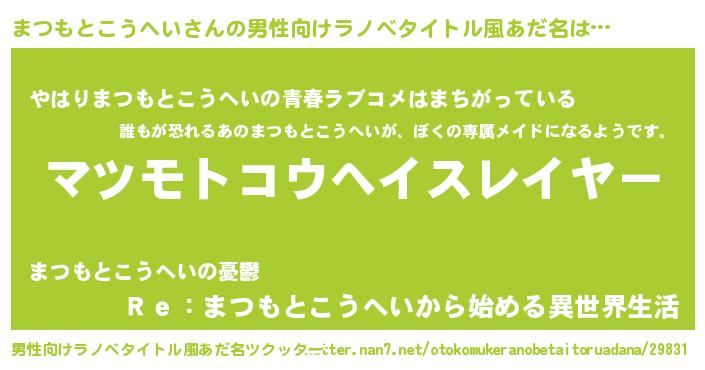 | 女子向けラノベタイトル風あだ名 | 『婚約破棄系悪役まつもとこうへいに転生したので、保身に走りました。』 |