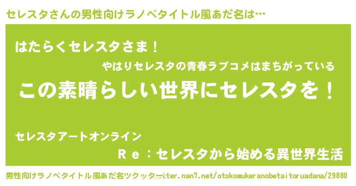 | 女子向けラノベタイトル風あだ名 | 『悪役セレスタに転生したようですが、知った事ではありません』 |
