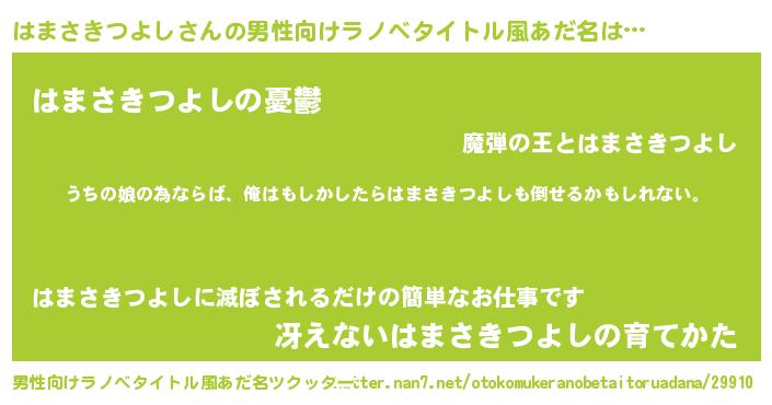 | 女子向けラノベタイトル風あだ名 | 『はまさきつよし伯爵の花嫁』 |