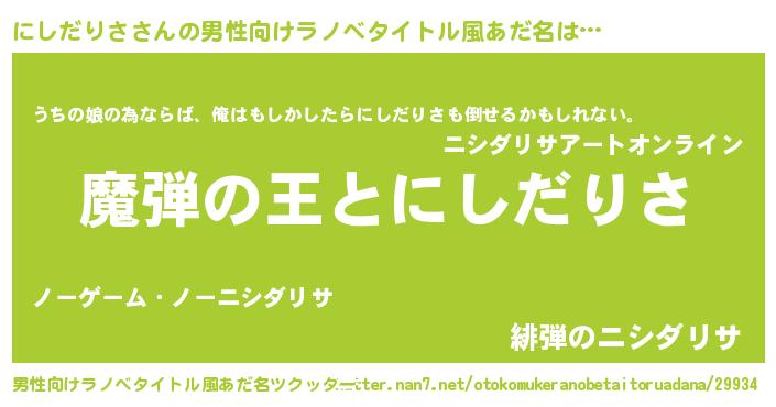 | 女子向けラノベタイトル風あだ名 | 『にしだりさが死なない童話 林檎のにしだりさの診療簿』 |