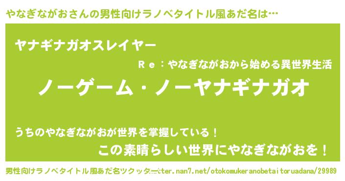 | 女子向けラノベタイトル風あだ名 | 『死神やなぎながおの再婚』 |