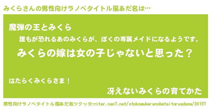 | 女子向けラノベタイトル風あだ名 | 『みくらの卵を拾いまして』 |