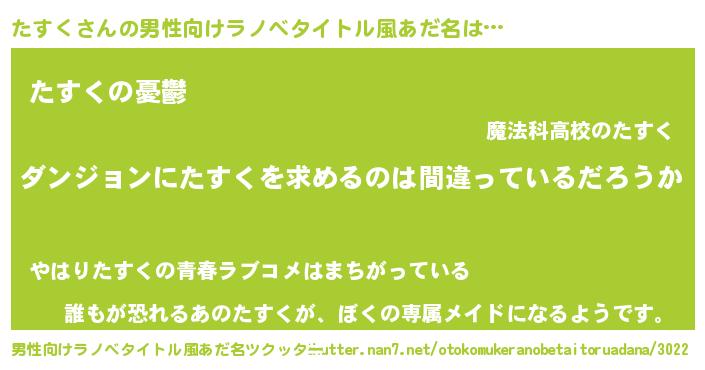 | 胡散臭い通販商品みたいなあだ名 | 『信頼と実績のサプリメント…その名も「たすく」』 |