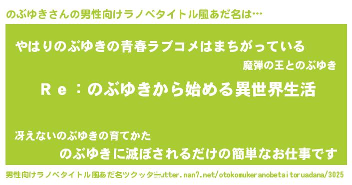 | 女子向けラノベタイトル風あだ名 | 『闇ののぶゆき』『のぶゆき伯爵の花嫁』 |