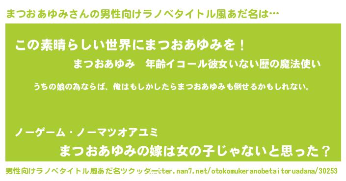 | 女子向けラノベタイトル風あだ名 | 『まつおあゆみ伯爵の花嫁』 |