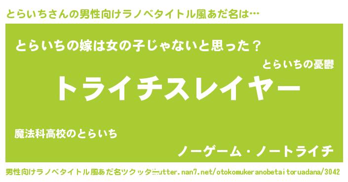 | 胡散臭い通販商品みたいなあだ名 | 『信頼と実績のサプリメント…その名も「とらいち」』 |
