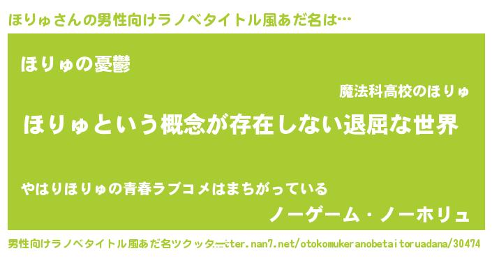 | 女子向けラノベタイトル風あだ名 | 『異世界で失敗しない100のほりゅ』 |