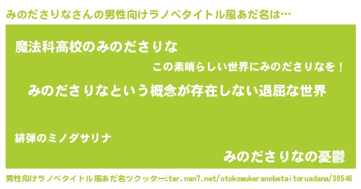 | 女子向けラノベタイトル風あだ名 | 『異世界で失敗しない100のみのださりな』 |