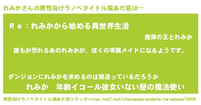 | 女子向けラノベタイトル風あだ名 | 『異世界でカフェれみかを開店しました。』 |