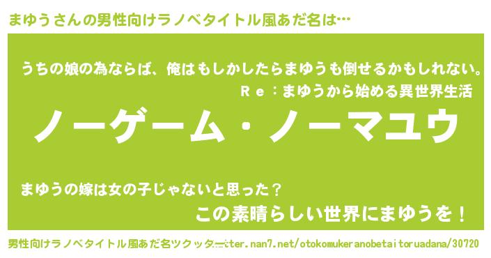 | 女子向けラノベタイトル風あだ名 | 『死神まゆうの再婚』『まゆう伯爵の花嫁』 |