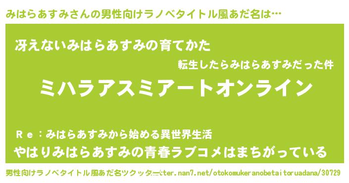 | 胡散臭い通販商品みたいなあだ名 | 『モテモテ間違いなし霊験あらたかなお札…その名も「みはらあすみ」』 |