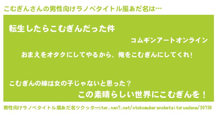| 女子向けラノベタイトル風あだ名 | 『こむぎん恋絵巻』『こむぎん様がみてる』 |