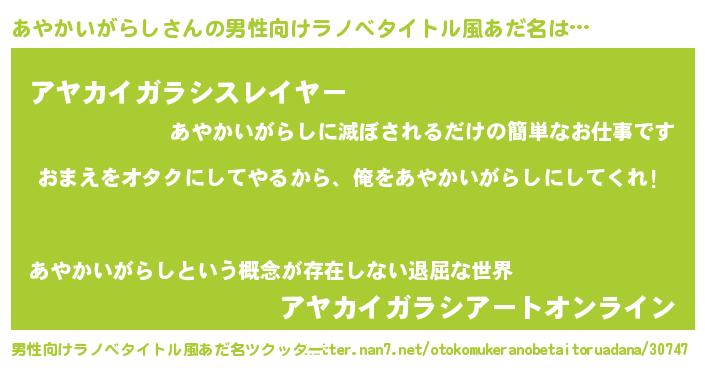 | 女子向けラノベタイトル風あだ名 | 『あやかいがらし夫妻のなれそめ』 |