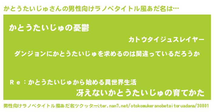 | 女子向けラノベタイトル風あだ名 | 『かとうたいじゅの卵を拾いまして』 |