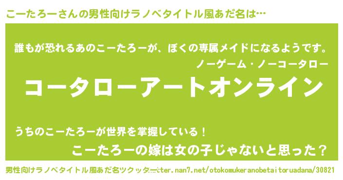 | 女子向けラノベタイトル風あだ名 | 『こーたろー姫と円卓の騎士』 |