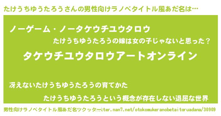 | 女子向けラノベタイトル風あだ名 | 『たけうちゆうたろう姫と円卓の騎士』 |