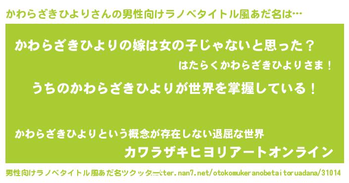 | ヒーロー風カッコイイあだ名 | 『炎刃騎士カワ』『ネオカワラザキヒヨリ』 |