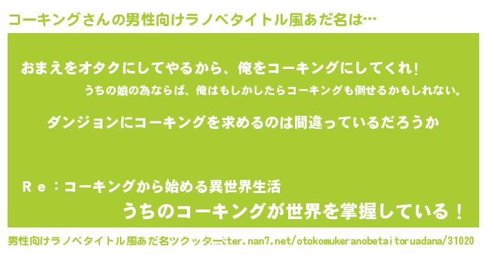 | 女子向けラノベタイトル風あだ名 | 『コーキングの卵を拾いまして』 |