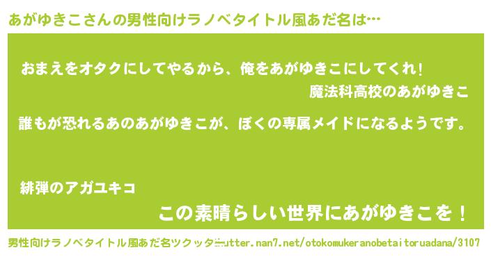 | 意味不明あだ名 | 『永久保存あがゆきこ』『自称あがゆきこ』 |