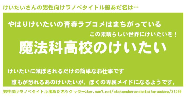 | 女子向けラノベタイトル風あだ名 | 『けいたいなんてお断りですっ。』 |