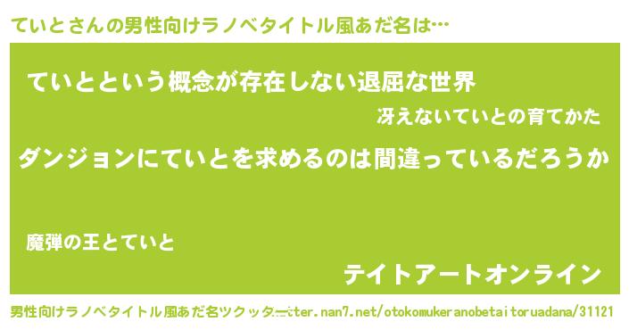 | 胡散臭い通販商品みたいなあだ名 | 『信頼と実績のサプリメント…その名も「ていと」』 |