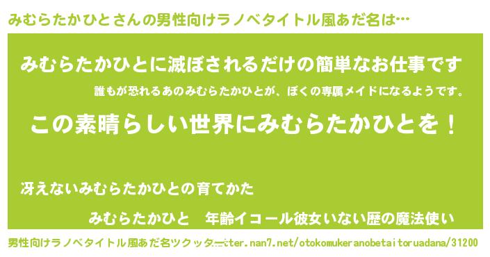 | 女子向けラノベタイトル風あだ名 | 『悪役みむらたかひとに転生したようですが、知った事ではありません』 |