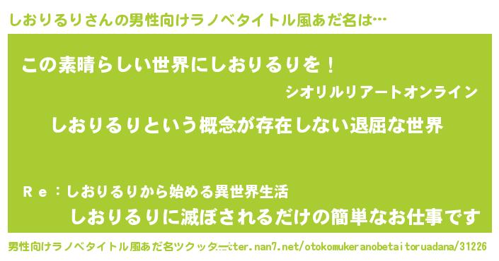 | 女子向けラノベタイトル風あだ名 | 『異世界で失敗しない100のしおりるり』 |