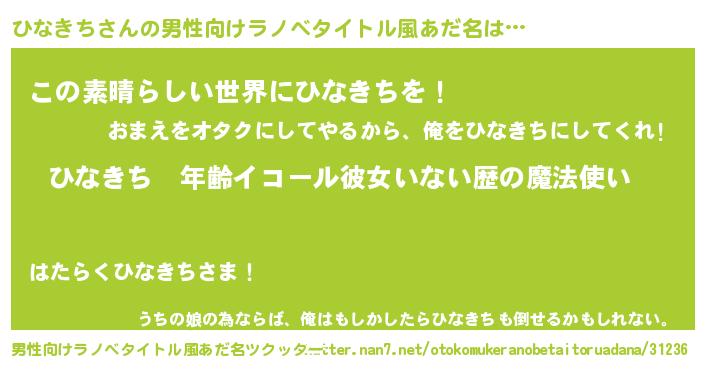 | 女子向けラノベタイトル風あだ名 | 『ひなきちの玉の輿計画!』 |