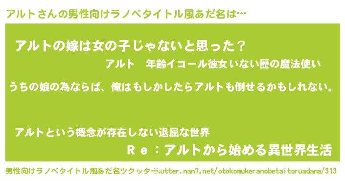 | 女子向けラノベタイトル風あだ名 | 『アルト伯爵の花嫁』『アルト様がみてる』 |