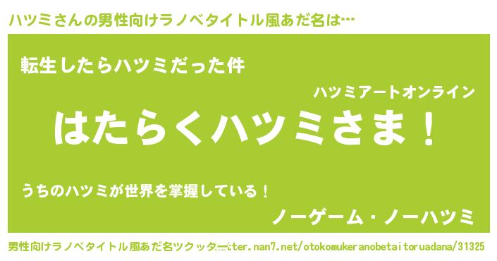 | 女子向けラノベタイトル風あだ名 | 『首の姫と首なしハツミ』『ハツミ恋絵巻』 |