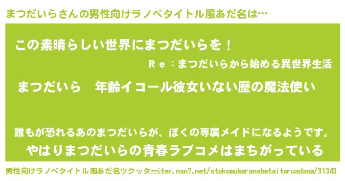 | 女子向けラノベタイトル風あだ名 | 『まつだいらの玉の輿計画!』 |