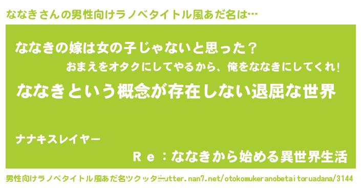 | 女子向けラノベタイトル風あだ名 | 『異世界で失敗しない100のななき』 |