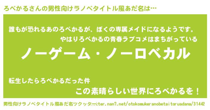 | 女子向けラノベタイトル風あだ名 | 『ろべかる恋絵巻』『ろべかるの契約王妃』 |