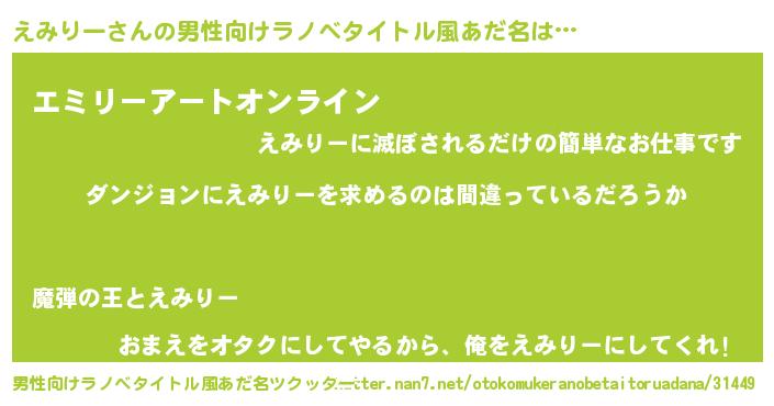 | 胡散臭い通販商品みたいなあだ名 | 『信頼と実績のサプリメント…その名も「えみりー」』 |
