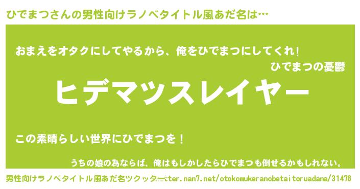 | 女子向けラノベタイトル風あだ名 | 『婚約破棄系悪役ひでまつに転生したので、保身に走りました。』 |