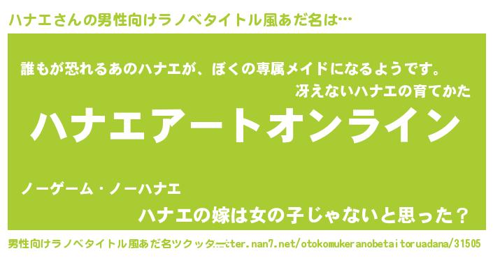 | 女子向けラノベタイトル風あだ名 | 『誰かこのハナエを説明してください! ~契約から始まるウェディング~』 |