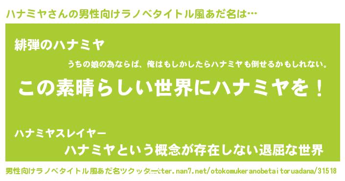 | ヘコむあだ名 | 『ハナミヤ(笑)』『牛乳』『ハナもー』 |