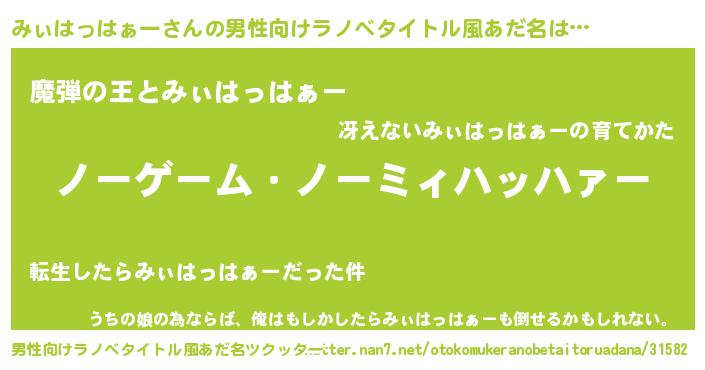 | 伝説のあだ名 | 『救世主となる錬金術士みぃはっはぁー』 |