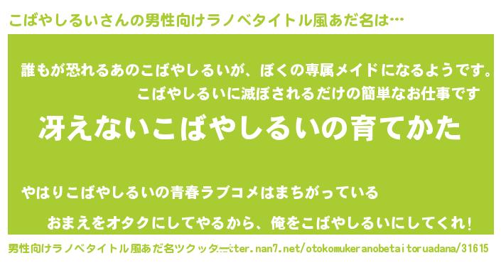 | 胡散臭い通販商品みたいなあだ名 | 『来世でも幸せになれる健康食品…その名も「こばやしるい」』 |