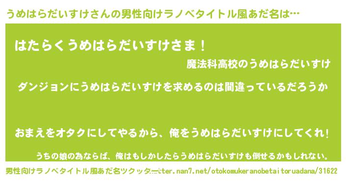 | 女子向けラノベタイトル風あだ名 | 『うめはらだいすけは平凡を望む』 |