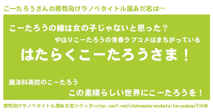| 胡散臭い通販商品みたいなあだ名 | 『信頼と実績のサプリメント…その名も「こーたろう」』 |