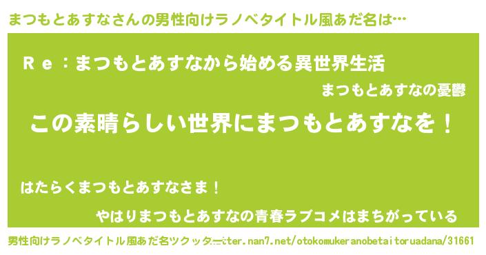 | 女子向けラノベタイトル風あだ名 | 『乙女ゲームの破滅フラグしかない悪役まつもとあすなに転生してしまった…』 |