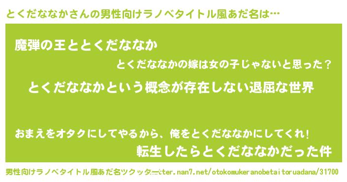 | 女子向けラノベタイトル風あだ名 | 『異世界で失敗しない100のとくだななか』 |