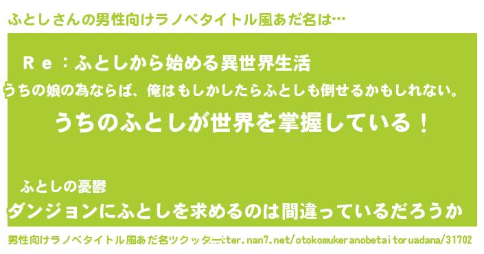 | 女子向けラノベタイトル風あだ名 | 『男装ふとしの憂鬱な任務』『闇のふとし』 |