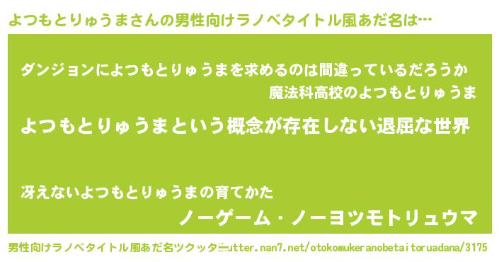 | 女子向けラノベタイトル風あだ名 | 『よつもとりゅうまの契約王妃』 |