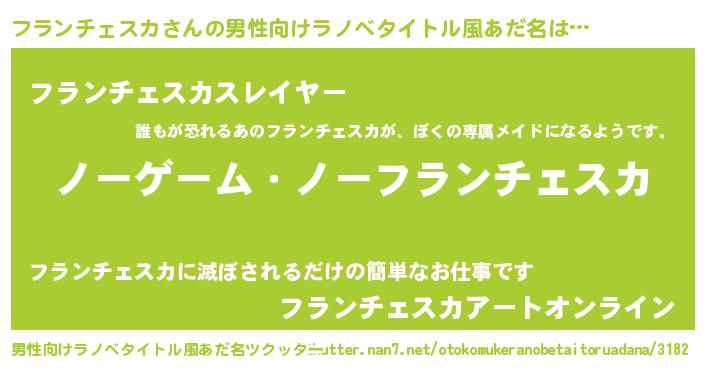 | 女子向けラノベタイトル風あだ名 | 『死神フランチェスカの再婚』 |