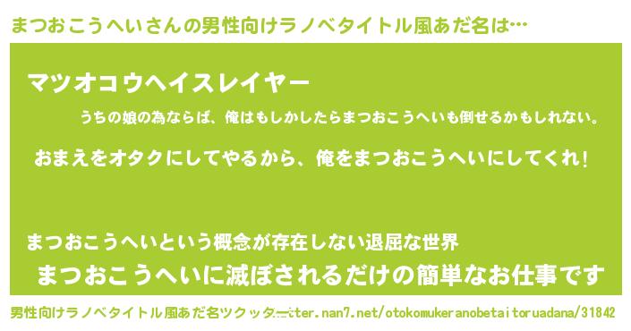| 女子向けラノベタイトル風あだ名 | 『まつおこうへい夫妻のなれそめ』 |