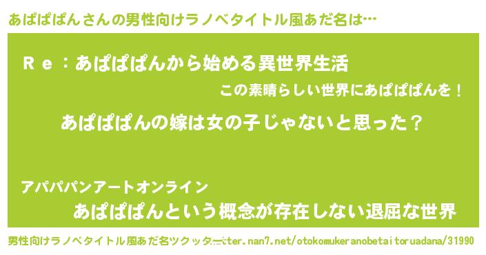 | 女子向けラノベタイトル風あだ名 | 『あぱぱぱんの卵を拾いまして』 |