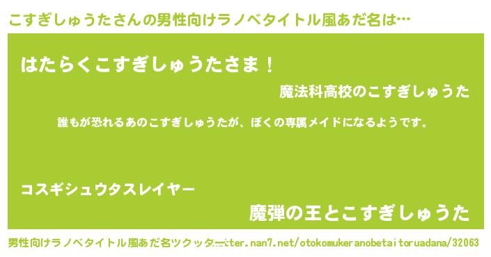 | 女子向けラノベタイトル風あだ名 | 『異世界でカフェこすぎしゅうたを開店しました。』 |