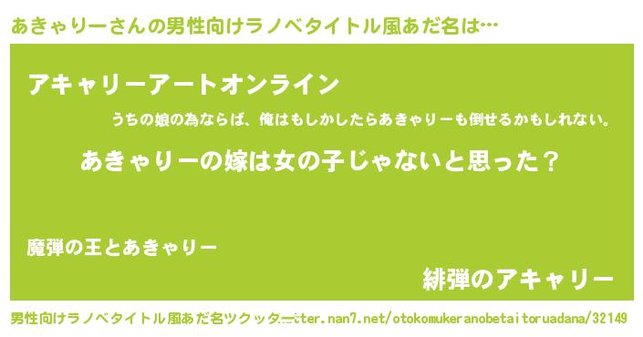 | 女子向けラノベタイトル風あだ名 | 『あきゃりーの卵を拾いまして』 |